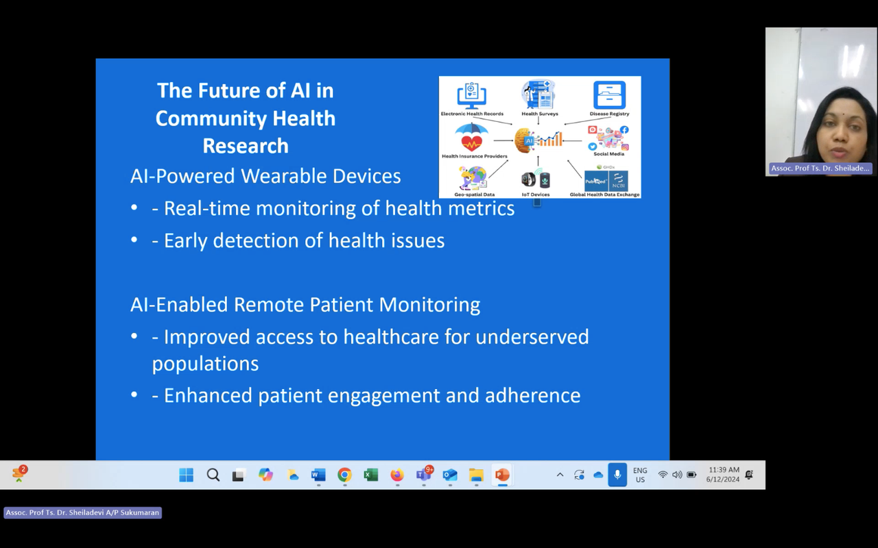 The symposium The Role of Artificial Intelligence in Enhancing Community Health Research on 10th January 2025 from 10 am-11.30 am. Around 16 participants attended the symposium. It explored the potential of Artificial Intelligence (AI) to revolutionize community health research. AI's ability to analyze vast datasets and identify patterns offers significant advantages. Firstly, AI accelerates data analysis, uncovering hidden insights from electronic health records and social determinants of health. This frees up researchers' time for interpretation and faster research progress. Secondly, AI aids in predictive modelling, allowing for early disease detection and optimized resource allocation. Additionally, AI facilitates personalized medicine through tailored treatment plans. Thirdly, AI expedites drug discovery by identifying potential drug candidates and optimizing clinical trials. It can also improve drug safety by analyzing data to detect potential risks early on. While the benefits are substantial, ethical considerations regarding data privacy, algorithmic bias, transparency, and a human-centered approach must be addressed. The future of AI in community health research is bright. Responsible AI use can enhance data-driven decisions, empower community engagement, accelerate drug discovery, and advance precision medicine. However, achieving this potential requires collaboration between researchers, clinicians, policymakers, and technology experts.